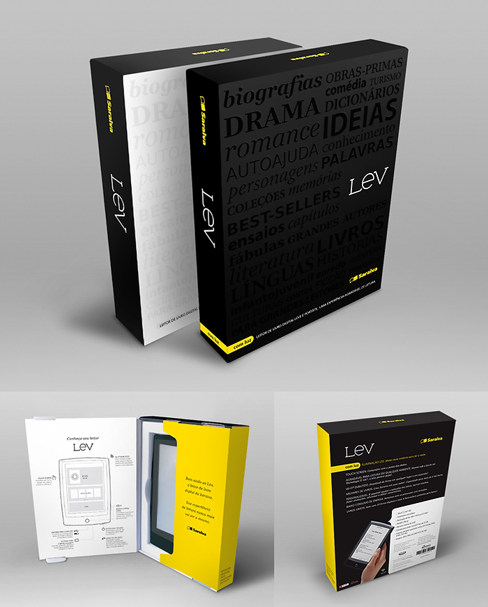 Identidade visual do Lev, leitor de livros digitais da Saraiva. Lev é uma nova experiência de leitura e não apenas um produto tecnológico. A criação de uma embalagem que mais parece um livro, deixa explícito o foco principal do produto: a leitura. O projeto englobou desde o naming até a entrega do brand book.